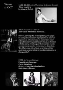 Se podrá disfrutar de dos clases magistrales enfocadas a las profesoras del Centro Municipal de Danza y algunas alumnas del mismo para que continúen su formación. La primera de ellas correrá a cargo de La Moneta y la segunda será impartida por José Galán bajo el título ‘Flamenco inclusivo’.