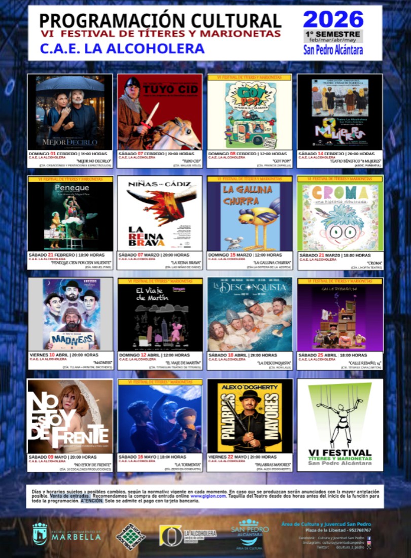 ¡La cultura no se detiene en San Pedro Alcántara! Presentamos una agenda cargada de talento, humor y artes escénicas para la primera mitad de 2026. Con sede en La Alcoholera Centro de Artes Escénicas, esta programación incluye desde grandes figuras de la escena nacional hasta la sexta edición del esperado Festival de Títeres y Marionetas, ofreciendo opciones para todos los públicos, desde los más pequeños hasta los amantes del teatro más crítico y social.